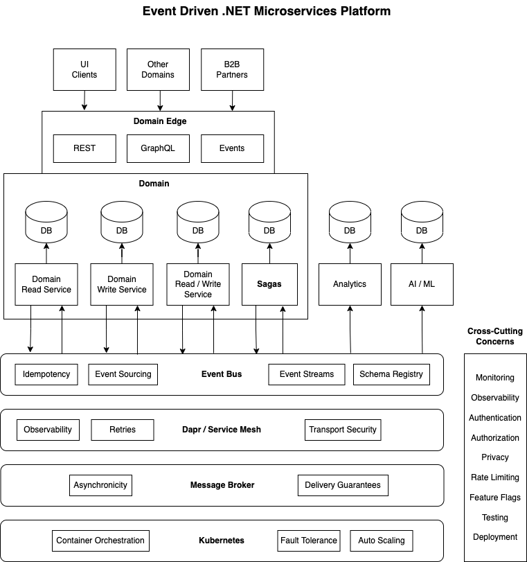 Event Driven .NET provides an event-driven microservices platform for .NET developers that combines DDD, CQRS and EDA patterns on top of a messaging layer consisting of an Event Bus, Service Mesh capabilities exposed by Distributed Application Runtime (Dapr), a Message Broker (such as Amazon SNS+SQS or Azure Service Bus), and Kubernetes for container orchestration (such as Amazon EKS or Azure AKS). The Event Bus relies on Dapr for pub-sub and has support for idempotency with an event cache that filters out duplicate events. It also uses a schema registry to validate messages for compatibility with registered schemas. Sagas in Event Driven .NET use the Event Bus to orchestrate updates across services so that they all succeed or roll back using compensating actions. The messaging layer allows for fine-tuning various cross-cutting concerns, such as monitoring and observability, security and privacy, rate limiting, feature flags, testing and deployment.