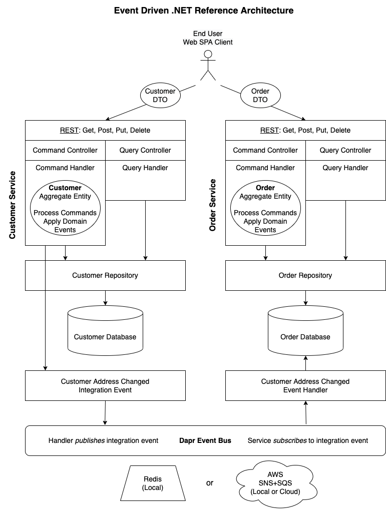 Rather than imposing a prescriptive framework that dictates one way to build microservices, Event Driven .NET provides a set of abstractions and libraries, deployed as NuGet packages, combined with reference architectures which illustrate how to build loosely coupled services, each scoped to an aggregate root and persisted to a private data store. Services have REST handlers with separate command and query controllers that accept Data Transfer Objects mapped to domain entities. Services communicate with one another over an Event Bus that uses Dapr to abstract away the concrete message broker implementation and enable observability with monitoring and tracing. Finally, services are deployed to Kubernetes for container orchestration, fault tolerance and responsive elastic scaling.
